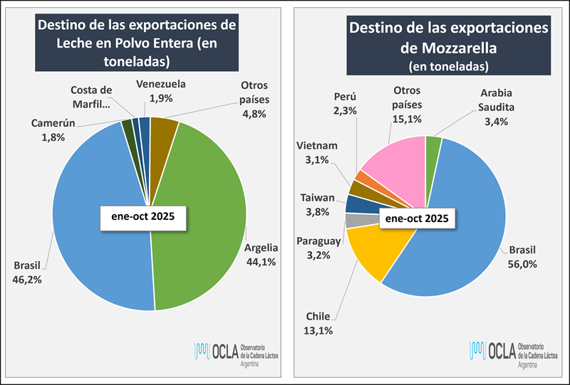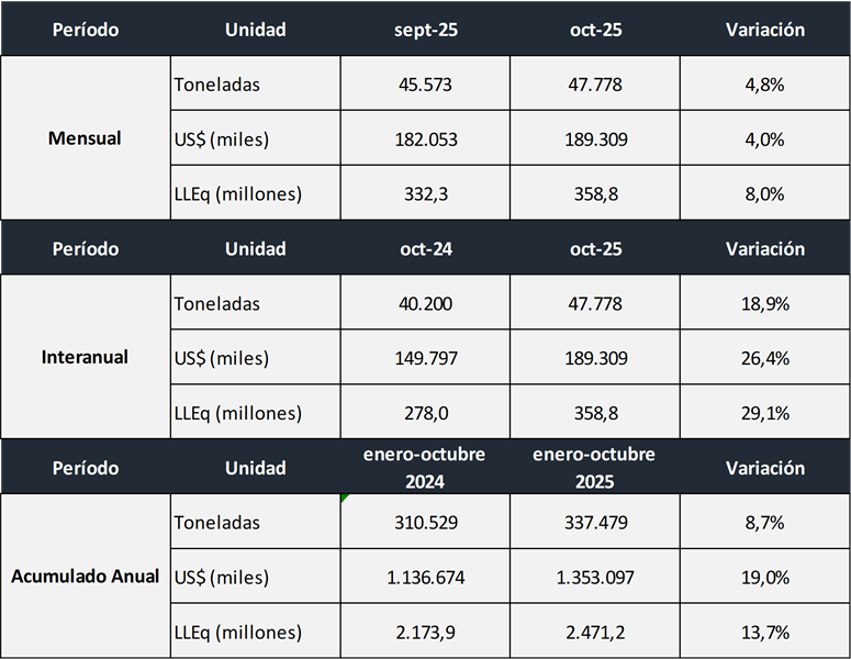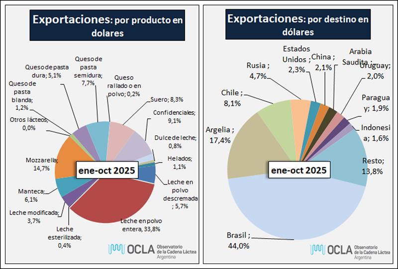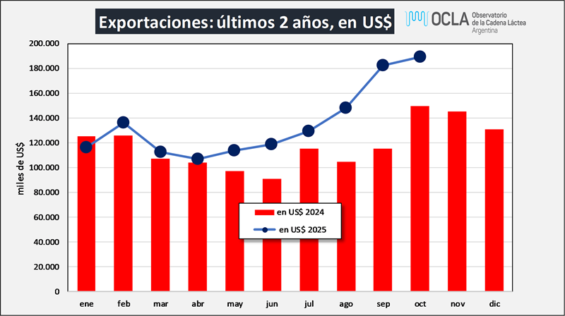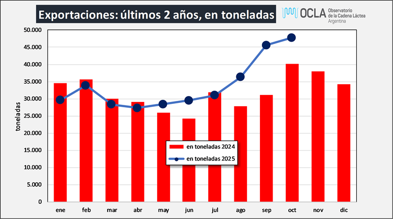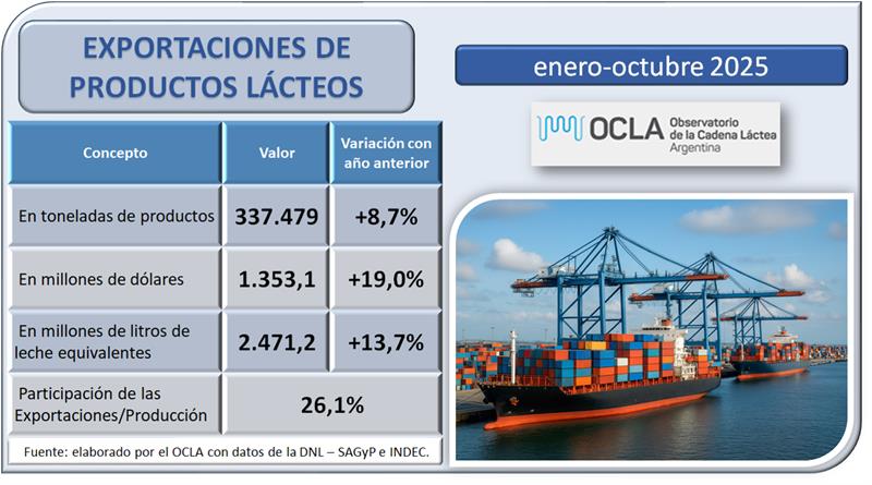 En litros de leche equivalentes a octubre de 2025, las exportaciones fueron superiores (+13,7%) en el interanual y representaron el 26,1% de la producción total (en ene-oct de 2024 representaron el 25,3%).