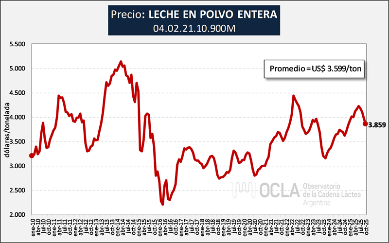 El precio medio de exportación por tonelada fue de US$ 3.032 para ene-oct de 2025, lo que implicó un incremento del 10,2% respecto a ene-oct de 2024. En el caso particular del rubro Leches en Polvo, el precio promedio fue de US$ 3.924/ton., un 9,8% por encima del año anterior.