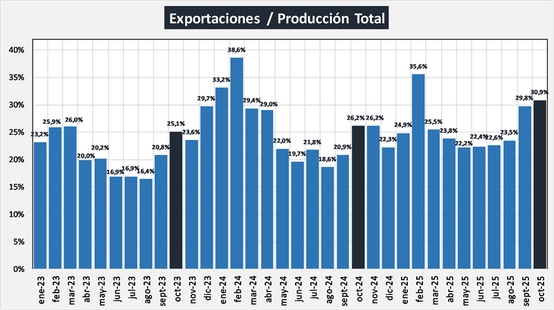 Octubre de 2025 tiene una participación de las exportaciones medidas en LLEq respecto a la producción total, más alta de los meses de octubre desde que se tienen registros de participación mensual (30,9%).