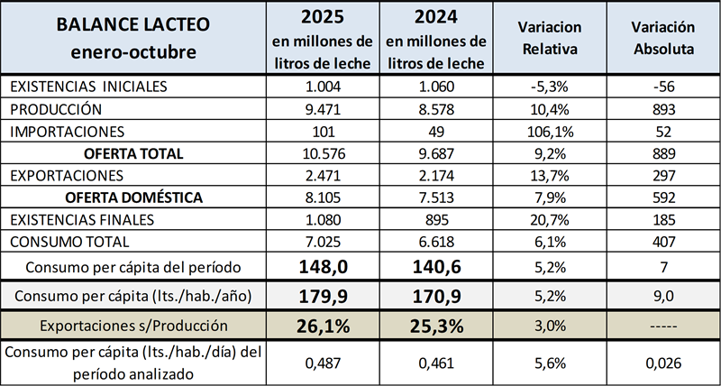 Análisis del Balance Lácteo a octubre 2025 y comparación con igual período del año anterior: