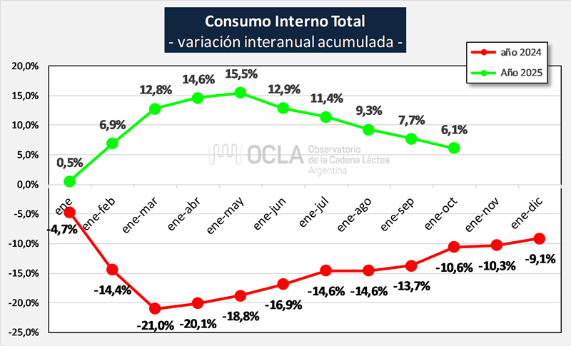 Los stocks finales de octubre 2025 son 20,7% superiores al año anterior. Por lo tanto, el consumo doméstico que surge por diferencia, arroja una cifra que está por encima del año pasado en un 6,1% recuperando una gran parte de la fuerte caída del año pasado que fue del 10,7% en los 10 primeros meses del año 2024.