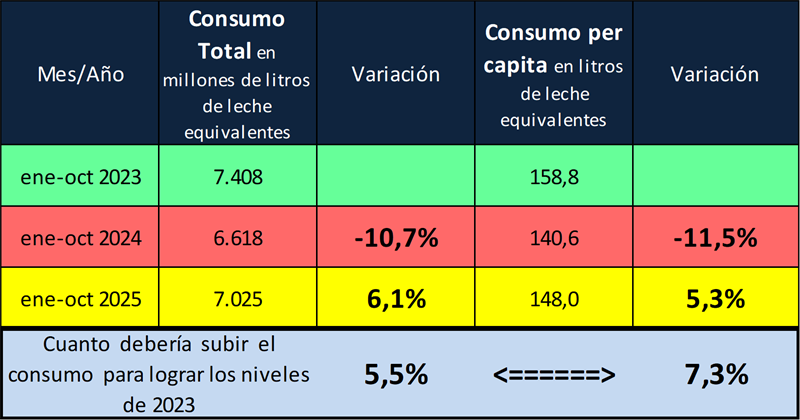 La diferencia inicial de stocks es de -56 M lts. que se contraponen con 893 M lts. de producción y 52 M lts. de importaciones adicionales al año anterior, lo cual genera una oferta de 889 M lts. superior al año pasado, de los cuales se exporto 297 M lts. más que el año pasado y quedan en stocks 185 M lts. más, lo cual determina un consumo de 407 M lts. superior al año anterior (+9,3%). El consumo per cápita corregido en días crece un 5,6% en el período enero-octubre de 2025.