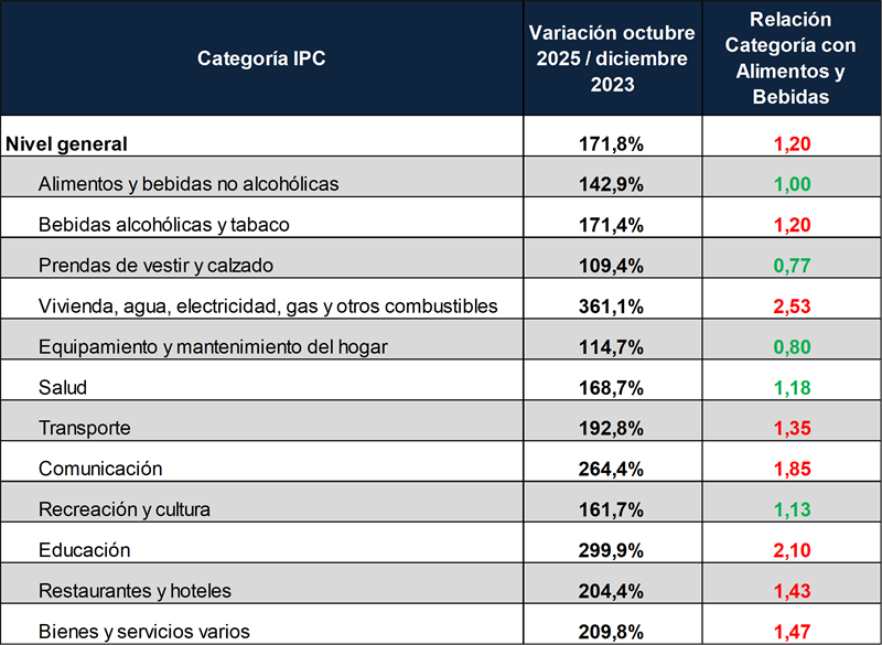 Sucede que si medimos la evolución del salario registrado en litros de leche equivalentes de mercado interno que ese salario puede comprar, ha habido una notable mejora, pero como puede verse en el cuadro de abajo, los alimentos y bebidas dentro de los cuales están los productos lácteos, que dicho sea de paso han subido menos que su propia categoría, han perdido participación en el destino total del ingreso ya que categorías como electricidad, gas, agua, educación, transporte, comunicaciones y salud, entre otros, han absorbido una mayor incidencia, quitando disponibilidad para el consumo de alimentos, sobre todo los de mayor valor agregado/unitario.
