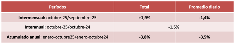 El índice en octubre 2025 baja respecto al mes anterior el 1,4% en promedio diario, siendo que la producción subió levemente (+0,8%) pero el precio promedio del VLE estuvo en moneda constante -2,3% por debajo al mes anterior. En la variación interanual la caída del índice fue del 1,5% y contrapone un crecimiento de la producción del 9,4% con una baja del VLE del 1,3%.