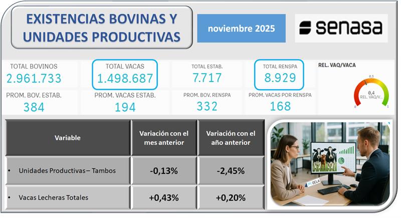 Con la información disponible de algunos meses, principalmente a marzo de cada año previas a contar ahora con el Tablero Dinámico Mensual podemos extrapolar por tendencia los meses previos. En base a lo descripto, la variación respecto al mes anterior es de -0,13% unidades productivas y +0,43% de vacas. La variación interanual de noviembre 2025 respecto a noviembre 2024 es de -2,45% unidades productivas y +0,20% de vacas (3.019 cabezas más que noviembre 2024, y 39.358 cabezas más que en noviembre de 2023).