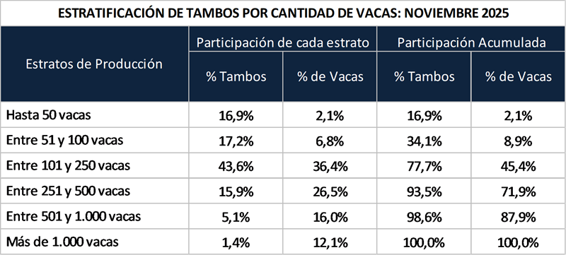 Abajo la estratificación en función a la cantidad de vacas, indicando la participación en función a la cantidad de tambos y luego de animales en producción. Como más significativo puede mencionarse que los tambos con más de 500 vacas totales en producción son sólo el 6,5% de los tambos, pero tienen el 28,1% de las vacas y aportan más de un tercio de la producción total de leche. En el otro extremo se encuentran los tambos de menos de 100 vacas totales en producción que son el 34,1% de los tambos, tienen el 8,9% de las vacas y generan menos del 10% de la producción total.