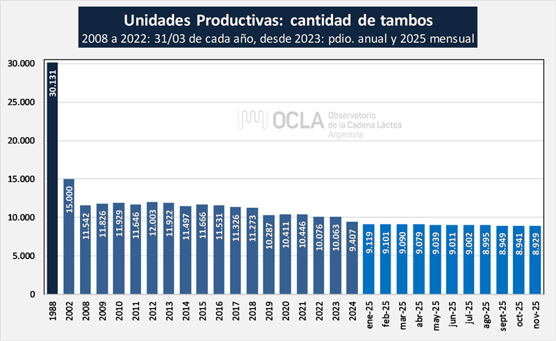 El año 2025 inició con 9.129 unidades productivas de las cuales en noviembre se registran 8.929, ello implica 200 tambos menos que si lo extrapolamos al año significaría un 2,6% menos, tasa muy levemente inferior a la observada en los últimos 10 años (-2,4% promedio anual).