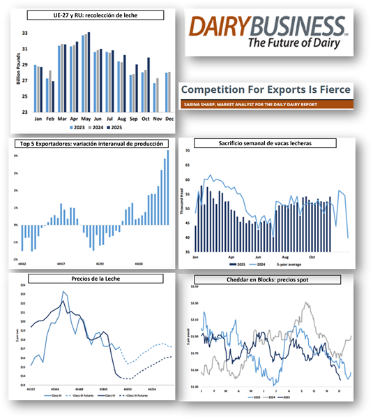 Las recolecciones de leche combinadas entre los cinco mayores exportadores de lácteos del mundo aumentaron un 4,3 % interanual en octubre, el crecimiento más rápido para el grupo desde 2014, cuando Europa se preparaba para poner fin a su sistema de cuotas. La competencia por las exportaciones es feroz, lo que provoca una carrera a la baja en los mercados lácteos. En la subasta Global Dairy Trade (GDT) de esta semana, el índice GDT prolongó su racha de ocho eventos de pérdidas. La caída del 4,3% lo llevó a su nivel más bajo desde principios de 2024. Las grasas fueron particularmente abundantes y baratas. El valor de la grasa láctea anhidra cayó un 9,8% en comparación con la subasta GDT de finales de noviembre. La mantequilla se desplomó un 12,4%. La leche desnatada en polvo (LDP) de GDT cayó a su precio más bajo en más de dos años, y la leche entera en polvo (LEP) marcó un nuevo mínimo anual.