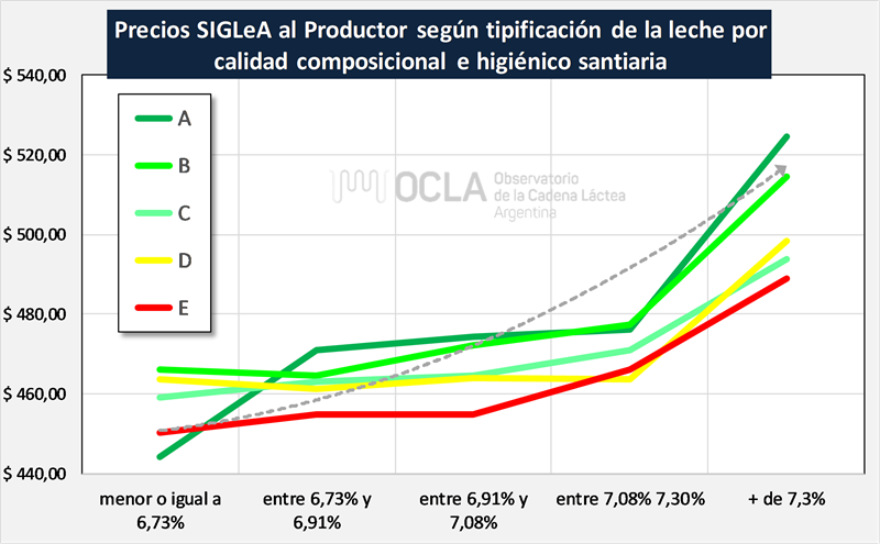 En el cuadro de tipificación, la leche comercializada se divide en 25 estratos según composición y calidad higiénico-sanitaria y, dentro de cada estrato, se muestra un promedio ponderado del precio del total de esos litros y además un promedio ponderado del 20% superior e inferior de los precios.