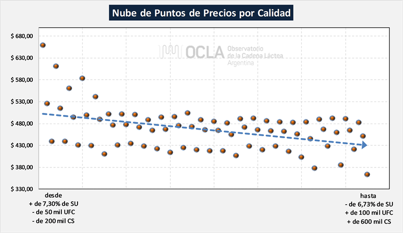 Si elaboramos una nube de puntos con los diferentes precios disponibles en función a las calidades, podemos observar que se da una pendiente descendente de precios a medida que es menor la calidad integral de la leche, pero esa pendiente podría ser mucho más pronunciada si se pretende mejorar/incentivar la mejor calidad de leche.