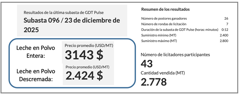 La subasta Nº 096 se ha llevado ha cabo en el día de hoy, martes 23 de noviembre, donde el precio promedio obtenido para la LPE ha sido de 3.143 US$/t, el cual representa una baja de 3,1% respecto a lo publicado en la última GDT pulse (3.243 US$/t) y de 0,6% respecto al último evento del GDT (3.161 US$/t).