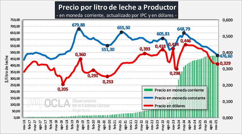 En una visión de más corto plazo el gráfico anterior muestra el precio por litro de leche actualizado a diciembre 2025 por inflación y que los precios del período febrero-diciembre de 2025, son los más bajos de esta comparación de cinco años.