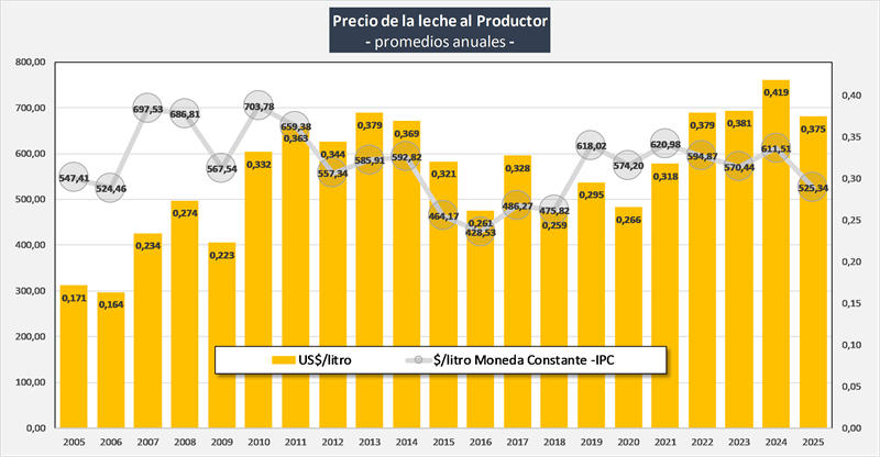 Por último y en función de finalizarse los datos del año 2025, en el siguiente gráfico se muestran los promedios anuales tanto en pesos ajustados por inflación, como en dólares por litro de leche. El promedio de 2025 fue de $ 525.34/litro y US$ 0.375/litro.