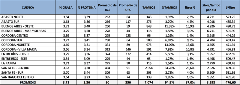 En el cuadro puede observarse que las columnas de participación en cantidad de tambos y producción, los totales no llegan al 100% ya que faltan los tambos fuera de cuencas tradicionales.