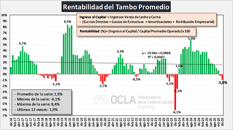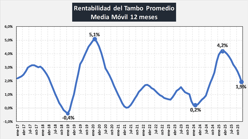 Como lo veníamos informando en oportunidades anteriores se había producido un fuerte desacople en diciembre 2023 (por la devaluación y la alta inflación), entre precios y costos y señalábamos que los precios de la leche venían creciendo por encima de la inflación y que pronto se produciría la convergencia, es por ello que ya en febrero de 2024 se puede observar una tasa de rentabilidad positiva que luego entre marzo 2024 y abril de 2025 se mantiene entorno al 4% con un pico de 5,8% en agosto de 2024. En noviembre próximo pasado la tasa de rentabilidad cae al -0,3% y ahora el último dato disponible (diciembre 2025), la tasa alcanza el 1% negativo y la tasa promedio de los últimos 12 meses al 1,9%.