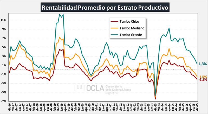 Cabe sí mencionar que, en el caso de los denominados tambos chicos, que tienen un promedio de producción diaria de 1.761 litros en los modelos de INTA, para diciembre arrojan una tasa de rentabilidad negativa del 2,1%, por lo que el costo de producción se encuentra por encima del precio percibido, los tambos del estrato medio perforan en octubre, noviembre y diciembre el nivel cero rentabilidad (-1,5% en diciembre) y los tambos más grandes (8.830 litros por día) logran una tasa del 1,3% menos de un tercio de la tasa exigida de 5% al Capital Promedio Operado. Todos, (salvo un par de meses) con tendencia decreciente en las tasas de rentabilidad en los últimos 16 meses.
