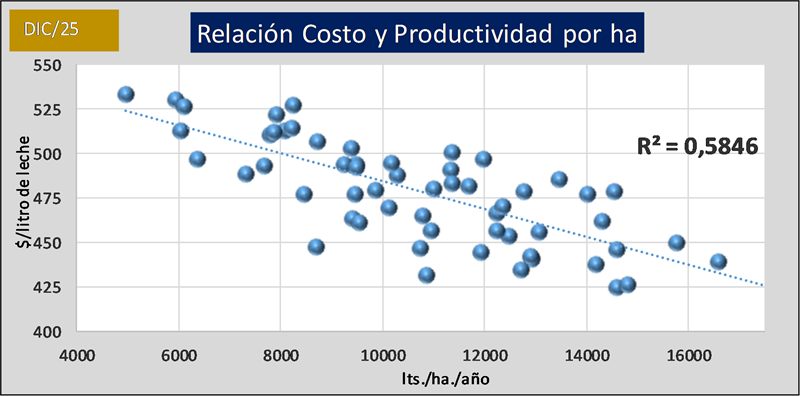 Por último, incorporamos el gráfico donde se obtiene la mayor correlación entre las variables económicas y productivas, en este caso la relación entre el Costo de Producción y la Productividad (medida en litros de leche por hectárea por año).
