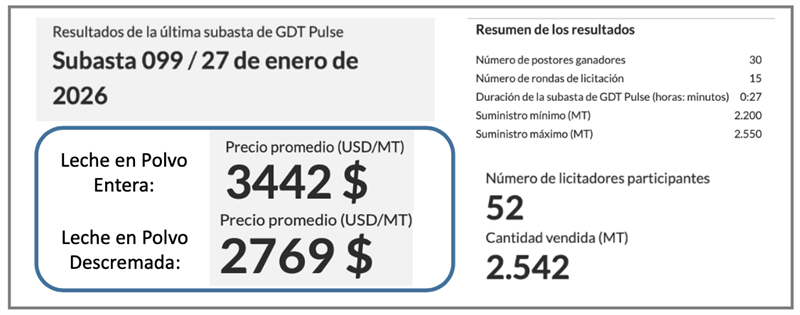 La subasta Nº 099 se ha llevado ha cabo en el día de hoy, martes 27 de enero, donde el precio promedio obtenido para la LPE ha sido de 3.442 US$/t, el cual representa una leve baja de 0,2% respecto a lo publicado en la última GDT pulse (3.448 US$/t) y respecto al último evento del GDT (3.449 US$/t).