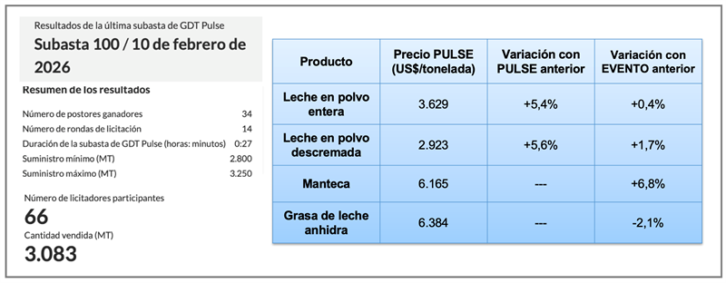 Es una prueba piloto que, inicialmente, ofrecerá subastas en semanas alternas entre los eventos comerciales de GDT (2do y 4to martes de cada mes, 5to también, si lo hubiere) durante un período de seis a doce meses Las subastas ofrecerán: Leche en Polvo Entera Regular, Período de contrato 2 y Leche en Polvo Descremada. En el día de hoy, martes 10 de febrero de 2026, en la subasta PULSE número 100 se han adicionado dos productos más: MANTECA y GRASA DE LECHE ANHIDRA