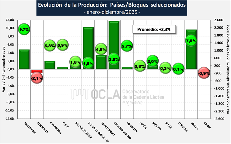 En el cuadro siguiente se toma un grupo seleccionado de los principales países que representan algo más del 55% de la producción mundial de leche de vaca, en el cual se puede observar una suba de la producción del 2,25%, para el año 2025 respecto al año 2024.