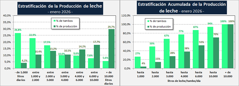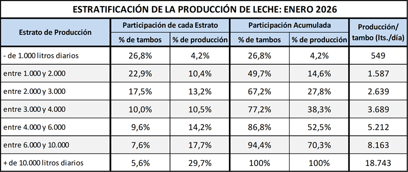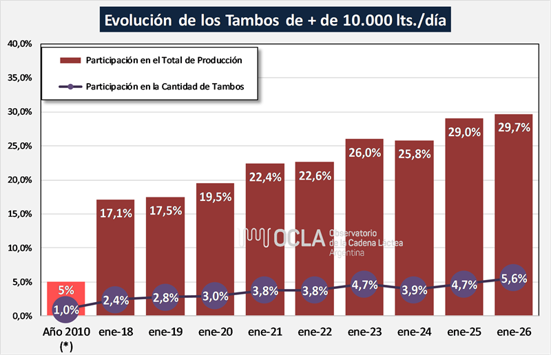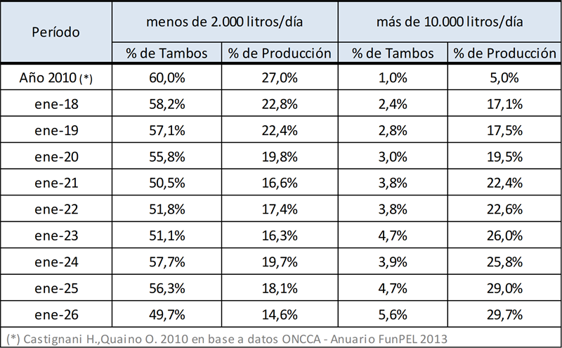 Entre 2010 y 2026 los tambos de menos de 2.000 litros de producción diaria vienen reduciendo significativamente su importancia relativa en la producción de leche total y los tambos de más de 10.000 litros diarios de producción, multiplicaron prácticamente por 6 su participación en la producción y la cantidad de tambos.