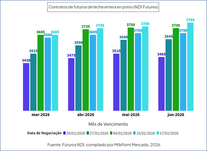 Desde la última subasta de GDT, los contratos de futuros de leche entera en polvo negociados en la NZX han seguido apreciándose, lo que refuerza la percepción de un escenario con un menor excedente mundial de leche. El mercado ya anticipa una desaceleración estacional de la oferta en los próximos meses, así como un crecimiento menos acelerado de la producción mundial a lo largo de 2026.
