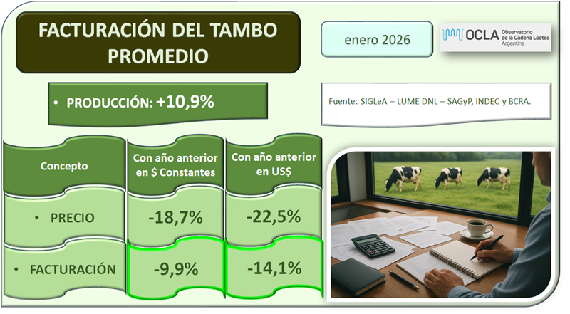 El tambo promedio SIGLeA-LUME que en enero de 2026 tuvo una producción diaria de 3.276 litros, facturó un 9,9% por debajo del año anterior, debido a una baja en el precio de 18,7% pero con una mejora de producción del 10,9%. En dólares en ese período la facturación fue 14,1% inferior a igual mes del año anterior.