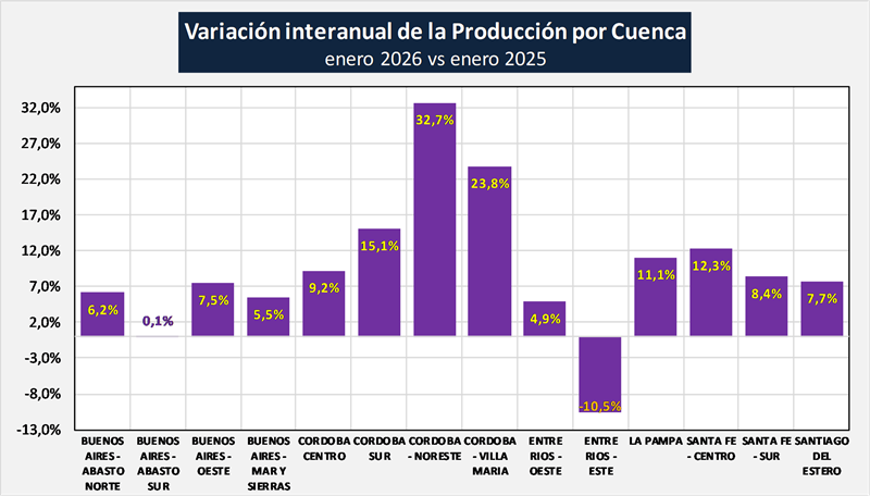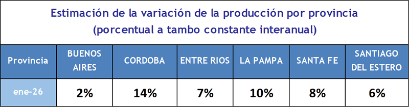 Se puede observar que la producción en las provincias tuvo grandes diferencias en su variación interanual en enero de 2026 comparada con igual mes del año anterior. Cabe mencionar que el término “tambo constante” hace referencia a comparar todos los tambos de los que se tiene información de producción en la actualidad, con esos mismos tambos del año pasado, dejando de lado aquellos tambos que dejaron de remitir información, que comenzaron a remitir información este año, los que cesaron la actividad y los que iniciaron actividad este año.
