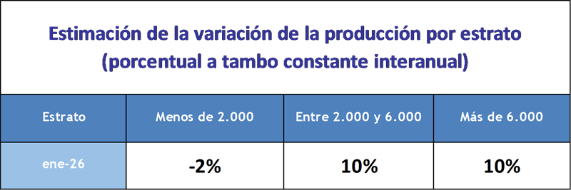 Si analizamos el comportamiento de la producción por estrato productivo, podemos observar que los estratos de más de 2.000 a 6.000 litros diarios de producción, al igual que los de más de 6.000, tuvieron un crecimiento interanual significativo (10%), en enero del año 2026. Por su parte el estrato de producción más bajo, presentó un descenso del 2% en su comparación interanual.