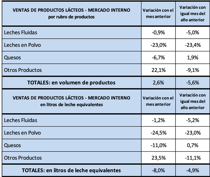 La comparación interanual (ene/26 vs ene/25) indicó una baja en volumen de productos del 5,6% y del 4,9% en litros de leche equivalentes.