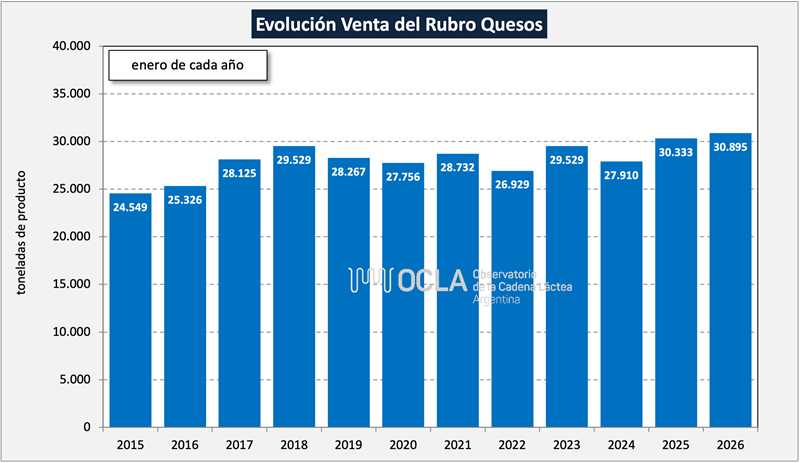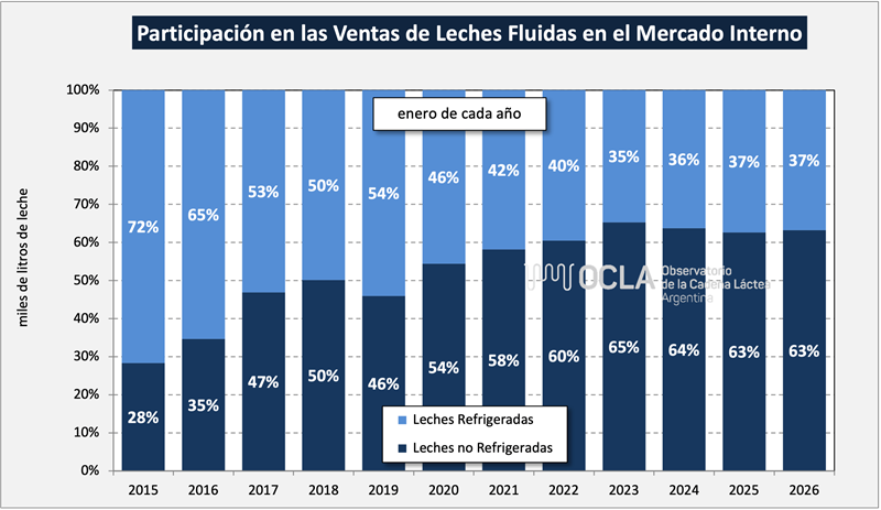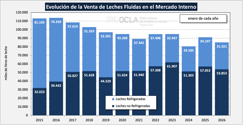 Las ventas según la Resolución 230/16 de la DNL presentaron para el mes de enero de 2026 un volumen 2,6% superior al mes pasado y en litros de leche equivalente bajaron 8,0% .