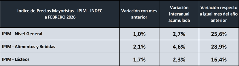 • Índice de Precios Internos Mayoristas – IPIM – Lácteos – febrero 2026 18/3/2026