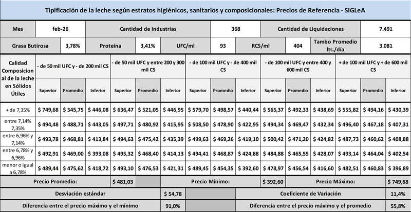 En el cuadro de tipificación, la leche comercializada se divide en 25 estratos según composición y calidad higiénico-sanitaria y, dentro de cada estrato, se muestra un promedio ponderado del precio del total de esos litros y además un promedio ponderado del 20% superior e inferior de los precios.