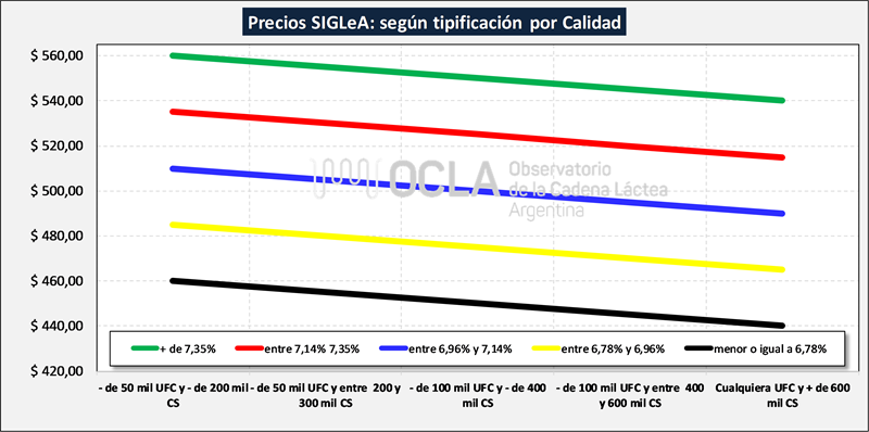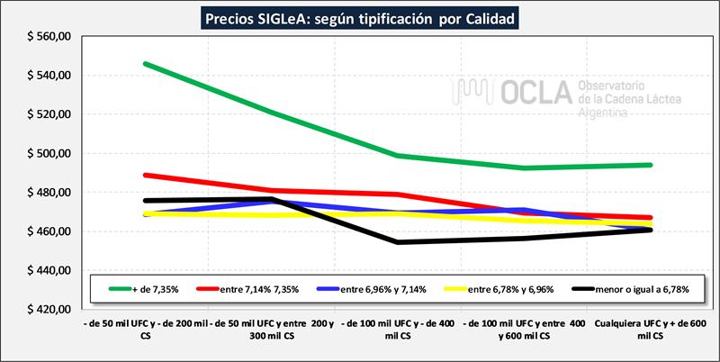 A pesar de no tener una proporcionalidad uniforme en cada curva de calidad se observa una tendencia decreciente del precio hacia la menor calidad y un orden más o menos riguroso entre las curvas, lo cual denota que existe un pago por calidad, que no es perfecto en virtud que también juegan bonificaciones comerciales que pueden estar especificadas y tabuladas (ejemplo: volumen, temperatura, distancia, permanencia, etc.) o arbitrarias en función a aspectos no especificados en los Sistemas de Tipificación y Pago de la Leche (netamente comerciales).