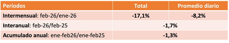 El índice en febrero 2026 baja respecto al mes anterior el 8,2% en promedio diario, siendo que la producción bajo -5,9% y el precio promedio del VLE estuvo en moneda constante -1,9% por debajo al mes anterior. En la variación interanual la caída del índice fue del 1,7% y contrapone un crecimiento de la producción del 10,6% con una baja del VLE del 11,7%.