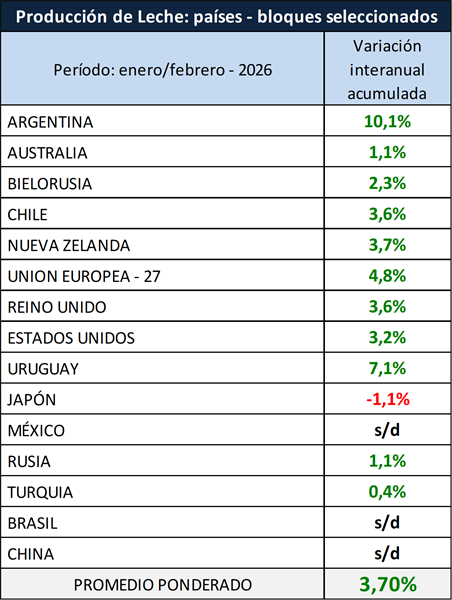 En el cuadro siguiente se toma un grupo seleccionado de los principales países que representan algo más del 55% de la producción mundial de leche de vaca, en el cual se puede observar una suba de la producción del 3,7%, para el primer bimestre de 2026 respecto a igual período del año anterior.