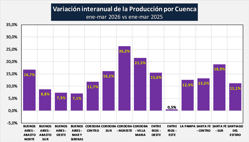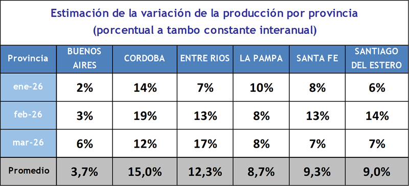 Se puede observar que la producción en las provincias tuvo grandes diferencias en su variación interanual en marzo de 2026 comparada con igual mes del año anterior. Cabe mencionar que el término “tambo constante” hace referencia a comparar todos los tambos de los que se tiene información de producción en la actualidad, con esos mismos tambos del año pasado, dejando de lado aquellos tambos que dejaron de remitir información, que comenzaron a remitir información este año, los que cesaron la actividad y los que iniciaron actividad este año.
