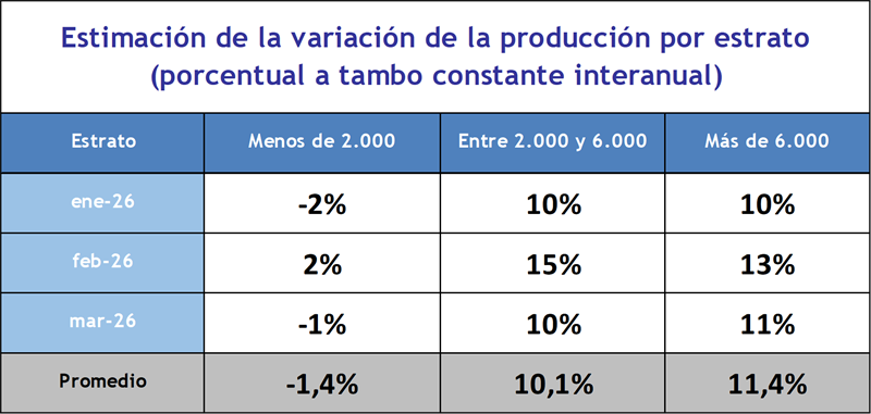 Si analizamos el comportamiento de la producción por estrato productivo, podemos observar que los estratos de más de 2.000 a 6.000 litros diarios de producción, al igual que los de más de 6.000, tuvieron un crecimiento interanual significativo del 11,4% y 10,1% respectivamente, en el primer trimestre de 2026. Por su parte el estrato de producción más bajo, presentó valores incluso inferiores respecto al primer trimestre del año pasado.