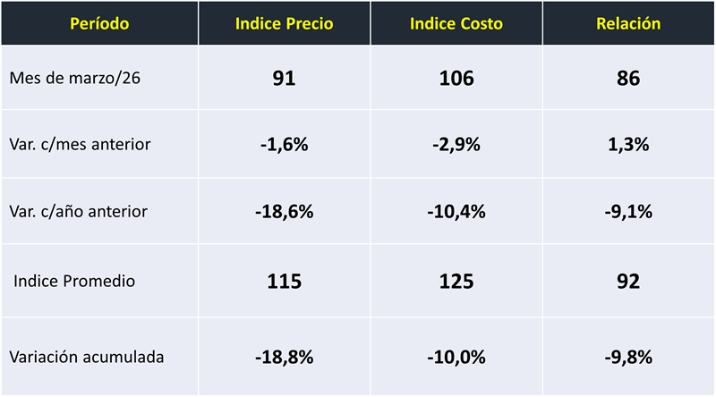En marzo de 2026 se cae el índice precio y el índice costo en mayor magnitud, lo que hace subir levemente la relación a un valor 86. En la comparación interanual el precio baja 8,2 puntos porcentuales más que el costo, lo que hace que la relación entre ambos ser reduzca un 9,1%. Como ya lo indicamos en el informe de costos, los precios se vienen ajustando por debajo de la inflación, pero una situación similar venía ocurriendo con los principales costos, lo cual mantenía favorables aún las relaciones de precios. Esa situación empeora en los cinco meses previos a febrero y se recompone algo en el último mes, más por baja de costos que por mejora de precios. Es importante que siga recuperándose el consumo doméstico y que mejore el valor efectivo en pesos de las exportaciones, sobre todo dado la continuidad en el crecimiento de la producción en términos interanuales.