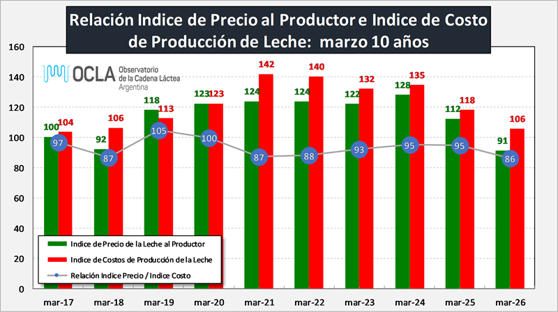 Se compara el Indice de Precios, de Costos y la Relación entre ambos para el mismo mes de la serie de 10 años y marzo de 2026 es la más baja relación de la serie.