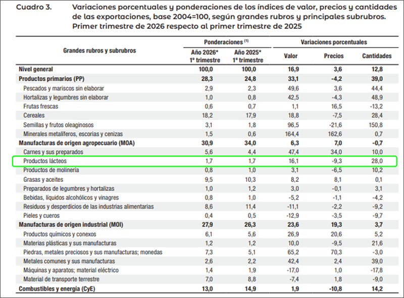 En el primer trimestre de 2026, los precios de las exportaciones registraron un aumento interanual de 3,6%, como resultado de las subas de 2,4% en enero, 4,7% en febrero y 3,9% en marzo.