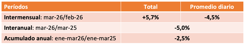 El índice en marzo 2026 baja respecto al mes anterior el 4,5% en promedio diario, siendo que la producción bajo -3,0% y el precio promedio del VLE estuvo en moneda constante -1,6% por debajo al mes anterior. En la variación interanual la caída del índice fue del 5,0% y contrapone un crecimiento de la producción del 7,9% con una baja del VLE del 12,0%.