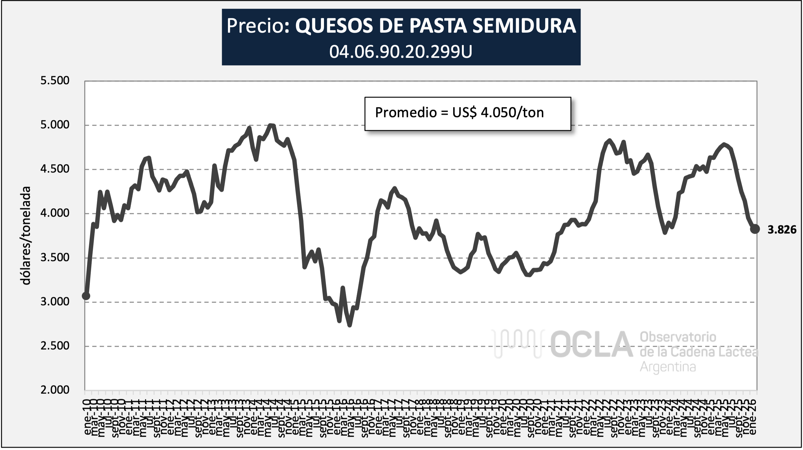 Precios promedios de exportaciones argentinas de Quesos de Pasta Semidura (Posición: 0406.90.20.299U)